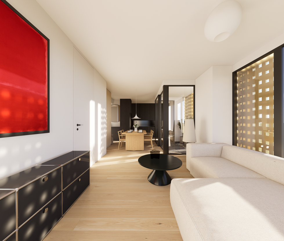 The apartment is revolved with a golden facade with moveable screens. The second layer are the black window frames. A black kitchen continuines this layer, fluently disentegrating into entrance hall following the outer walls of the apartment. The third layer is revolving around the inner walls of the space and portrays itself in light oak. Calm and comfortable furniture is scattered freely in space with burgundy red accents.